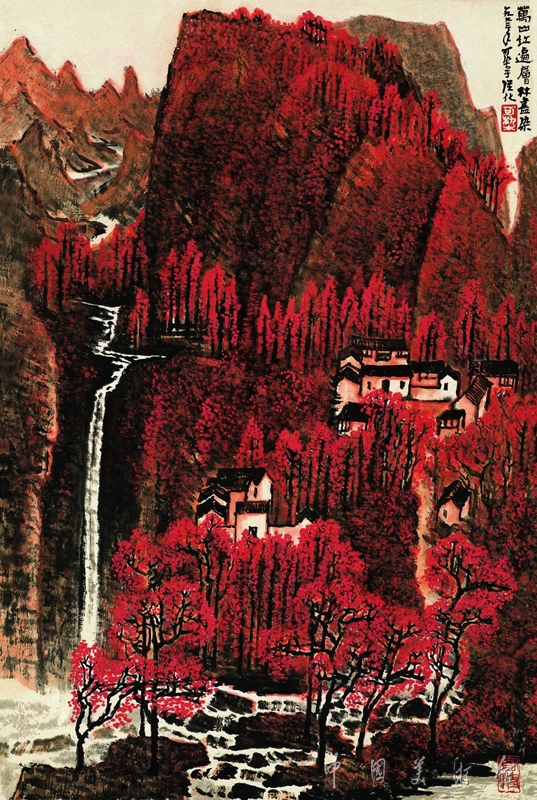 《万山红遍层林尽染》是根据毛泽东诗词《沁园春·长沙》所作。李可染喜读毛主席诗词,并从那激越豪迈的诗里领略山水画的境界。此画是据“万山红遍,层林尽染”句意再造了一个艺术世界,在黑红对比中写南国深秋景色,带有理想化的诗意色彩。